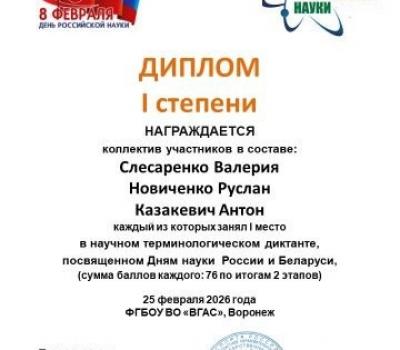 16.04.202625 февраля на базе "Воронежской академии спорта" и нашего университета состоялся научно-терминологический диктант, посвященный Дню науки России и Беларуси, в котором успешно выступили студенты 3 курса факультета физической культуры ( специальность "Тренерская деятельность"): Слесаренко Валерия, Новиченко Руслан, Казакевич Антон, которые завоевали 1 место и набрали максимальное…